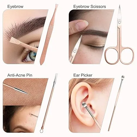 טיפול פנים: פינצטה לעיצוב גבות, מנקה אוזניים וכלי ייעודי לטיפול באקנה ונקודות שחורות.