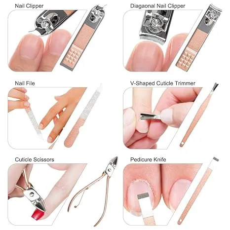 טיפוח כפות ידיים: קוצצי ציפורניים בגדלים שונים, פצירה (משייף) ודוחף עור.