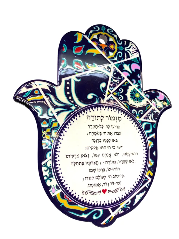 ישנו כוח מיוחד במילה "תודה", וכשמדובר במזמור לתודה, האנרגיה בבית משתנה לחלוטין. חמסת הקרמיקה הייחודית שלנו נוצרה עבור אלו המבקשים להקיף את עצמם בתזכורת יומיומית לשפע הקיים בחייהם. עם הכיתוב העוצמתי של פתיחת המזמור, החמסה הזו משמשת כקמיע של שמירה, ברכה והכרת הטוב. היא מוסיפה נופך רוחני עמוק לכל קיר או שולחן, ומשרה אווירה של רוגע וביטחון בלב הבית.