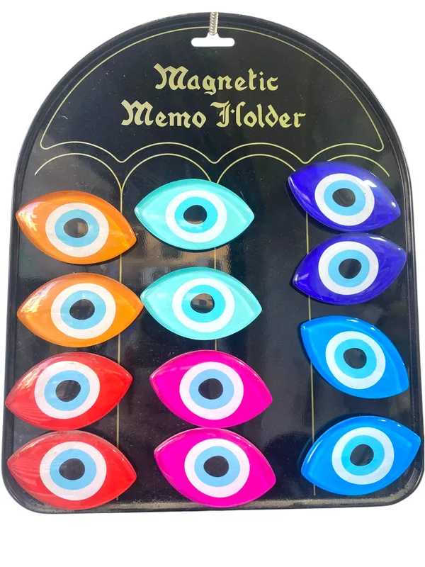 סט 12 מגנטים מזכוכית בעיצוב עין הרע למקרר וללוח מגנטי. מגיע ב-6 צבעים (2 מכל צבע), מידות כ-3×4 ס״מ. מוסיף סטייל, סדר ואנרגיה טובה לבית ולמשרד.