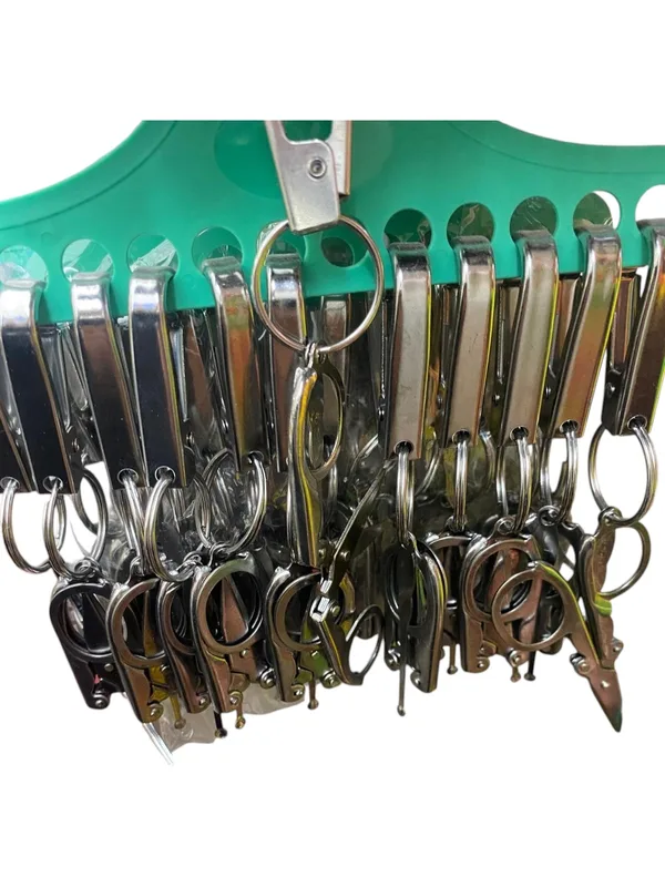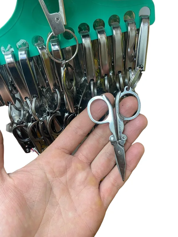 מחזיק מפתחות שאקל (Carabiner): כל זוג מספריים מצויד בשאקל מתכת חזק, המאפשר אבטוח מיידי לטבעת המפתחות, לרוכסן האפוד או ללולאת המכנס.